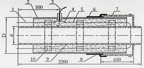 1 - проводники-индикаторы системы ОДК; 2 - оболочка из полиэтилена; 3 - кабель-вывод; 4 - соединительная муфта; 5 - изоляция из пенополиуретана; 6 - термоусаживаемая лента; 7 - металлическая заглушка изоляции; 8 - герметик; 9 - стальная труба; 10 - центрирующая опора. Примечания: 1. d - наружный диаметр трубы, D - наружный диаметр полиэтиленовой оболочки. 2. Кабель трехжильный 3×1,5 мм2 длиной 200 мм. Комплект удлинения кабеля поставляется отдельно. 3. По заказу кабель выводится из торца ЗИМ. Элемент трубопровода с кабелем вывода