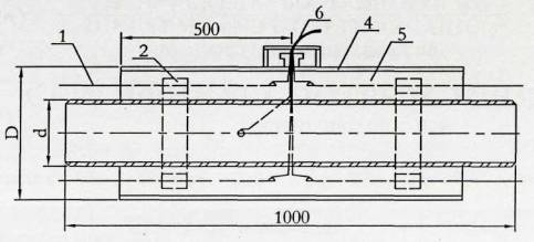 1 - проводники-индикаторы системы ОДК; 2 - центрирующая опора; 3 - оболочка из полиэтилена; 4 - стальная труба; 5 - изоляция из ППУ; 6 - кабель-вывод. Примечание: Кабель пятижильный 5×1,5 мм длиной 200 мм. Комплект удлинения кабеля поставляется отдельно. Наземный ковер системы ОДК
