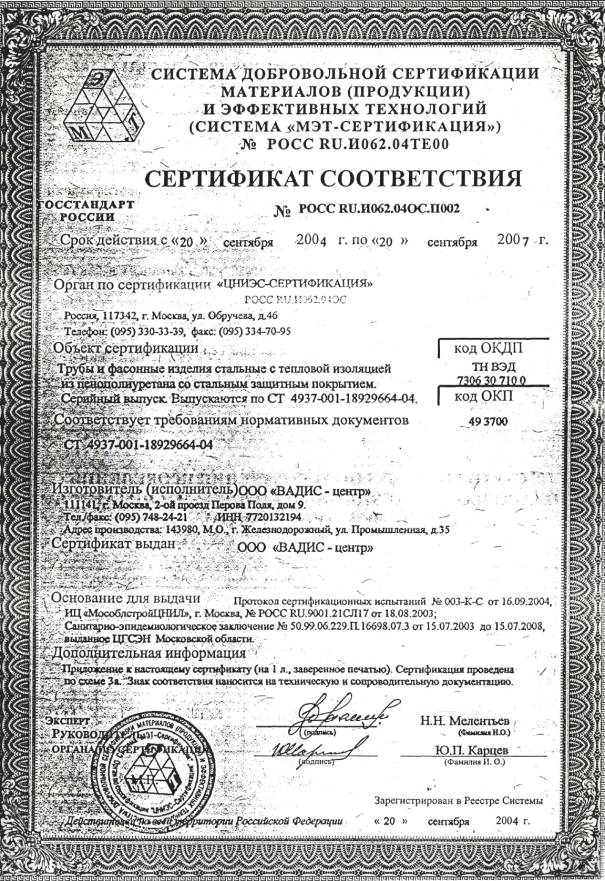 АССОЦИАЦИЯ ПРОИЗВОДИТЕЛЕЙ И ПОТРЕБИТЕЛЕЙ ТРУБОПРОВОДОВ С ИНДУСТРИАЛЬНОЙ ПОЛИМЕРНОЙ ИЗОЛЯЦИЕЙ ООО «ВАДИС-центр» ЭЛЕМЕНТЫ ТРУБОПРОВОДОВ С ЗАВОДСКОЙ ТЕПЛОГИДРОИЗОЛЯЦИЕЙ ИЗ ППУ С ЗАЩИТНЫМ ПОКРЫТИЕМ КАТАЛОГ ИЗДЕЛИЙ МОСКВА Содержание ООО «ВАДИС-центр» - организация с высоким научно-техническим и технологическим потенциалом организовано в 1997 году и специализируется на производстве теплогидроизолированных труб и фасонных изделий в пенополиуретановой (ППУ) изоляции с защитным покрытием из полиэтиленовых труб-оболочек или оболочек из оцинкованной стали для бесканальной или надземной прокладки теплотрасс и трубопроводов горячего и холодного водоснабжения. Современное отечественное оборудование, прогрессивные технологии и материалы, многолетний опыт работы в сфере тепловой и низкотемпературной изоляции оборудования и трубопроводов позволяют ООО «ВАДИС-центр» производить продукцию, отвечающую самым строгим требованиям по надежности, долговечности, экологической безопасности. Трубы и фасонные изделия, выпускаемые ООО «ВАДИС-центр», соответствуют требованиям ГОСТ 30732-2001 «Трубы и фасонные изделия стальные с тепловой изоляцией из пенополиуретана в полиэтиленовой оболочке», СТ 4937-001-18929664-04 «Трубы и фасонные изделия стальные с тепловой изоляцией из пенополиуретана со стальным защитным покрытием», ТУ 5768-001-45127991-99 «Трубы стальные с теплоизоляцией из пенополиуретана и защитным покрытием», ТУ 5768-001-45127991-00 «Изделия фасонные с теплоизоляцией из пенополиуретана и защитным покрытием» и сертифицированы государственными органами Российской Федерации. К настоящему времени продукция ООО «ВАДИС-центр» нашла применение от Юга РФ до Крайнего Севера (п/о Ямал), от Калининградской обл. до Восточной Сибири и не имеет рекламаций. Теплогидроизолированные в заводских условиях трубы и фасонные детали представляют собой трехслойную монолитную конструкцию, в которой внутренняя труба воспринимает давление теплоносителя, полиэтиленовая труба или стальная оцинкованная труба-оболочка выполняет функции гидрозащиты и защиты от механических воздействий, теплоизоляционный слой из ППУ, являющегося наиболее эффективным теплоизоляционным материалом, располагается в кольцевой полости между внутренней трубой и защитной оболочкой. Для сварки стальных труб на трассе все элементы имеют неизолированные концы длиной 150 или 210 мм. Кроме того, поставляемые элементы трубопроводов оснащаются проводниками системы оперативного дистанционного контроля (СОДК) за влажностными состоянием теплоизоляции, которые прокладываются внутри слоя ППУ. Основная сфера деятельности ООО «ВАДИС-центр» состоит в обеспечении строительных организаций теплогидроизолированными ППУ трубами, фасонными деталями, приборами системы ОДК, теплогидроизолированной запорной арматурой и другими комплектующими деталями, обеспечивающими полный комплект элементов для прокладки трасс диаметром от 25 до 530 мм. При производстве осуществляется технический и нормативный контроль на всех стадиях технологического процесса, а все сварные швы стальных труб и фасонных деталей и изделий проверяются методом ультразвуковой дефектоскопии. Номенклатура труб и фасонных деталей, выпускаемых ООО «ВАДИС-центр» составляет полный комплект, достаточный для строительства теплопроводов диам