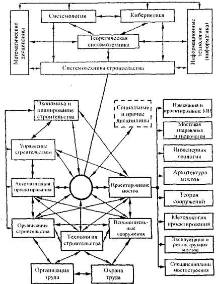 Рис. 1. Схема разработки сложной технической системы: циклы: 1 - проблемный; 2 - тематический; 3 - отраслевой; 4 - конструкторский; 5 - проектный; 6 - производственный; 7 - строительно-монтажный; 8 - отладочно-пусковой; _______ - прямые связи; ---------- - обратные связи Следует отметить важную роль обратных связей, которые являются основными системными факторами и играют решающую роль в процессе разработки системы. Каждый цикл, в свою очередь, характеризуется внутренней структурой и определенным научно-производственным уровнем. 2.3. Системотехника мостостроенияСистемотехника отечественного мостостроения (СМ) с позиций методологии системного подхода впервые рассмотрена СР. Владимирским, хотя системные подходы в решении отдельных проблем мостостроения были успешно использованы Л.С. Блинковым, Б.С. Малышевым, В.И. Шмидтом, К.С. Силиным, Г.П. Соловьевым, А.Л. Цейтлиным и др. Объектами системотехники мостостроения являются не столько традиционные инженерные объекты (хотя бы и достаточно сложные), а качественно иные, «деятельностные» образования - системотехнические комплексы мостостроения (СТКМ), синтезированные в соответствии с потребностями социально-хозяйственной практики. При этом, согласно А.Д. Холлу, любой системотехнический комплекс (СТК) будет состоять из двух частей: самого создаваемого, управляемого и развивающегося объекта и практической деятельности, направленной на создание и организацию функционирования СТК. Для достижения поставленных целей в системотехнике мостостроения решаются следующие общие проблемы: • выявление и описание наиболее общих для СТКМ системных свойств и закономерностей; • установление технологических переделов и потоков вещества, энергии и информации в СТКМ и формирование критериев их эффективности. Традиционно мостостроение рассматривается и как сфера научной деятельности, что, естественно, можно отнести и к системотехнике мостостроения. Системотехника мостостроения как междисциплинарная наука представлена СР. Владимирским определенной структурной схемой (рис. 2).