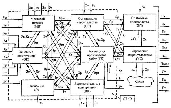 Рис. 2. Системотехника мостостроения (СМ) как междисциплинарная наука Каждый из блоков данной схемы составляет специальную дисциплину, которая имеет свой предмет, методологию и развивается в известной мере автономно. Это характерно для все более углубляющейся дифференциации знаний. Однако решение сложных практических проблем эффективно только и условиях интеграции знаний, что собственно и реализуется при системном подходе. При системном проектировании мостов следует во взаимосвязи рассматривать следующие аспекты (составляющие): теорию; конструкции; технологию; организацию; управление; эксплуатацию. Отсюда можно вывести ряд принципов, которыми целесообразно руководствоваться как при разработке проектов, гак и в научных исследованиях: - теоретико-конструктивный; - конструктивно-технологический; - организационно (управляюще)-технологический; - адаптивно-конструктивный (приспособленность конструкции к условиям эксплуатации, ремонта, реконструкции). Указанные принципы образуют широкую область для научной и практической деятельности в мостостроении. В более узком аспекте в системном подходе выделяют системотехнический комплекс объекта (СТКО). Системотехнический комплекс объекта (мостового сооружения) включает как элементы естественных, так и искусственных систем, а его модель представляет собой концептуальную систему. Эта система сложная, динамическая, но не целенаправленная в том смысле, что цель и функции системы задаются извне органом принятия решений. По мнению автора, мостостроительные системы следует отнести к целенаправленным, цель которых сформирована надсистемой (например, органом принятия решений), что согласуется с подходом других авторов. С точки зрения взаимодействия с окружающей средой, СТКО-активная система, причем не только окружающая среда используется ею для обеспечения своего функционирования, но и сам комплекс воздействует на среду. Однако процессы взаимодействия СТКО с окружающей средой совершаются, в основном, под управлением надсистемы. Структурная схема информационных связей СТКО, согласно С.Р. Владимирскому, представлена на рис. 3. Здесь выделено шесть подсистем: мостовой переход (МП), основные конструкции (ОК), экономика (Э), организация строительства (ОС), технология производства работ (ТП), вспомогательные конструкции (ВК). Указанные подсистемы определяют макроструктуру СТКО. Во входных данных здесь используются материалы изысканий (Ид), такие качества объекта, как потребительские (Кп), архитектурно-эстетические (Аэ), эргономические (Эр), эксплуатационные (Эт), экологические (Эк), конструктивные (Кт), а также технологические требования (Тт), характеристики материалов (Хм), организационные условия строительства (Оу), экономические (Эо) и ресурсные ограничения (Ро), параметры расходования ресурсов (Пр), управляющие воздействия (ΔУс, ΔУт). Выходными данными служат информационные обратные связи (Ос); показатели качества: назначения (Пн), конструктивности (Пк), экономичности (Пэ), эстетичности (Пэс), эргономичности (Пэр), экологичности (Пэкол), технологичности (Пт), управляемости (Пу), а также показатели эксплуатационных (Пэк) и организационных качеств (По). Между подсистемами СТКО на разных стадиях его функционирования актуализируются следующие информационные связи: конструктивные решения мост