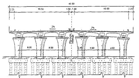 Рис. 5. Вид на промежуточную опору и поперечные сечения пролетных строений путепровода при пересечении МКАД с ул. Саломеи Нерис Ширины их ездовых полотен составляют соответственно 38 и 19 м, кроме того, они имеют по два тротуара шириной соответственно 1,5 и 1,35 м. В плане ось путепровода на Щелковском шоссе прямая, но пересекает МКАД под углом 80°, в связи с этим в плане пролетные строения косые. Кроме того, пролетное строение этого путепровода расположено на вертикальной выпуклой кривой радиусом 10000 м. Ось путепровода на ул. Соломеи Нерис в плане состоит из участков прямой и горизонтальных кривых переменного и постоянного радиусов, что усложняло производство работ при реализации циклической продольной надвижки. Третий из вышеуказанных построенных путепроводов состоит из двух неразрезных коробчатых пролетных строений со схемами 25 + 2 × 39 + 25 м. На рис. 6 приведен вид на промежуточные опоры и поперечные сечения пролетных строений путепровода при пересечении МКАД с Волгоградским проспектом на Новорязанском шоссе. Каждое пролетное строение в поперечном сечении состоит из трех коробок, имеет одностороннее ездовое полотно шириной 19,5 м и тротуар шириной 2,25 м. Разделительная полоса между пролетными строениями этого путепровода составляет 2 м. Общая ширина двух пролетных строений равна 45,5 м. В плане пролетные строения косые: ось пролетных строений с осями промежуточных опор пересекается под углом 43°. Четвертый построенный путепровод при пересечении МКАД с автомобильной дорогой Реутов - Ивановское состоит из неразрезного железобетонного монолитного плитно-ребристого шестипролетного строения со схемой 23,5 + 20,1 +2×31 +21 + 20,1 м. На рис. 7 приведено поперечное сечение средней балки плитно-ребристого пролетного строения этого путепровода. Поперечное сечение пролетного строения состоит из трех тавровых балок с шириной ребра до 3,5 м и высотой 130 см, объединенных плитой толщиной от 35 до 55 см, имеет ездовое полотно шириной 19,5 м и тротуары шириной 2,25 м. Общая ширина пролетного строения равна 24 м. В плане пролетное строение косое: его ось с осями промежуточных опор пересекается под углом 65°. Расстояние от низа пролетных строений всех построенных путепроводов до проезжей части МКАД составляет 550 см.