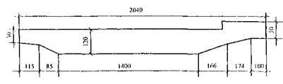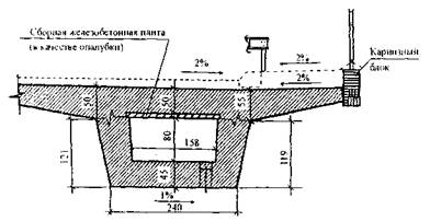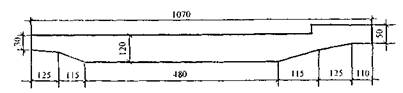 Рис. 8. Схема поперечного сечения правого пролетного строения путепровода при пересечении МКАД со Щелковским шоссе Высота монолитных железобетонных плитных пролетных строений одинакова и постоянна по всей длине путепровода (120 см), что составляет 1/25 средних и 1/18 крайних пролетов. Ширина различна, что определяется их габаритом.
