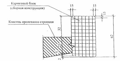 Рис. 11. Узел примыкания сборного карнизного блока к монолитному пролетному строению путепровода при пересечении МКАД с Волгоградским проспектом на Новорязанском шоссе Средняя коробка пролетного строения этого путепровода с крайними коробками объединена монолитной железобетонной плитой толщиной 30 см и шириной 170 см. Над опорами коробки имеют диафрагмы в виде сплошных монолитных железобетонных стенок толщиной 180 см (рис. 12).