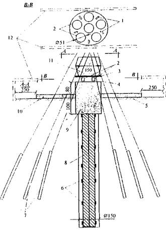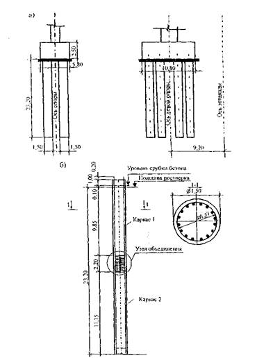 Рис. 15. Конструкция буронабивных свай: а - расположение свай в опорах эстакады; б - общий вид буронабивной сваи диаметром 150 см