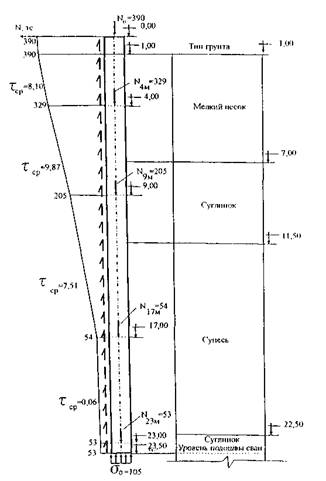 Рис. 18. Силовое взаимодействие сваи (Ø - 0,8 м) с грунтом: σ - нормальные напряжения по торцу (тс/м2); τ - касательные напряжения по боковой поверхности (тс/м2) Несущая способность сваи-стойки определяется формулой