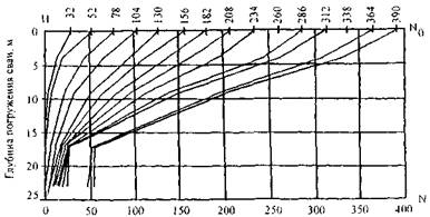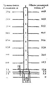 Рис. 26. Схема зависимости объема уложенной бетонной смеси от уровня ее в скважине Объем уложенной бетонной смеси допускается замерять на месте укладки с помощью тарированной бадьи, а также по данным бетонного завода о количестве выданной бетонной смеси, определяемом по числу замесов. Объем скважины следует определять по ее фактическим размерам, выявленным во время приемки, а положение низа бетонной трубы в скважине - с использованием разметки на трубе. Контроль заглубления низа бетонолитной трубы в смесь требуется производить после укладки каждой порции смеси, доставленной к месту производства работ, но не реже, чем после использования 4 м3 смеси. Таблица 7
