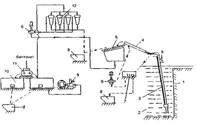 Рис. 20. Принципиальная схема циркуляции и очистки глинистого раствора: 1 - буровая скважина; 2 - глинистый бентонитовый раствор; 3 - эрлифт (возможное использование); 4 - труба-лоток; 5 - вибросито; 6 - насос; 7 - промежуточная емкость; 8 - шламосборник; 9 - грязевый насос; 10 - емкости; 11 - глиномешалка; 12 - гидроциклон Бурение скважины производится агрегатом AF-18 фирмы АМТ с ковшовым буром и предусматривает следующую технологическую последовательность (рис. 21).