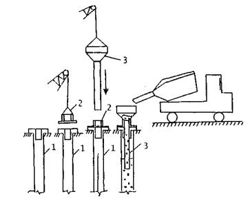 Рис. 22. Укладка бетона в скважину по методу ВПТ: 1 - скважина с глинистым раствором; 2 - опорный патрубок; 3 - вибробункер с бетонолитной трубой Сначала собирают бетонолитную трубу на полную длину из инвентарных секций с уплотнением стыков между секциями резиновыми прокладками. Водонепроницаемость трубы проверяется посредством подачи в нее через заглушки на торцах сжатого воздуха под давлением 3,5 атм. Затем устанавливают опорный патрубок для бункера, вводят в скважину нижнюю и последующие секции бетонолитной трубы и монтируют приемный бункер. В устье трубы на поверхность глинистою раствора насыпают 30-сантиметровый слой древесных опилок для исключения контакта раствора с первой порцией бетонной смеси, а в устье воронки приемного бункера вставляют металлическую пробку-заглушку, которую подвешивают на тросе. Низ бетонолитной трубы должен находиться на 20-30 см выше дна забоя скважины. Подача бетонной смеси в бетонолитную трубу осуществляется бадьей через приемный бункер с регулируемым раствором либо непосредственно из смесителя. Первая порция бетонной смеси, как правило, составляет 2,8 м3 затем заглушка извлекается краном, и бетонная смесь под собственной массой продавливается в скважину. Уровень бетона в скважине должен находиться на расстоянии 2,2-2,5 м от дна забоя и постоянно контролироваться. Подача бетонной смеси в скважину должна осуществляться непрерывно в требуемом объеме. При бетонировании перерывы в подаче бетонной смеси в приемный бункер не должны превышать 1,5 ч. По мере подачи смеси бетонолитная труба поднимается (например, краном ДЭК-25). В соответствии с требованиями CHиП 3.03.01-87 нижний конец бетонолитной трубы при бетонировании должен находиться в слое укладываемой бетонной смеси на глубине не менее 0,8 м и не более 2 м. Когда верхняя секция бетонолитной трубы выходит на поверхность, то выполняется ее демонтаж. Для этого трубу вывешивают (например, на двух швеллерах № 20), стык разъединяют, верхнюю секцию опускают краном на землю и приемный бункер присоединяют краном к нижней секции. После завершения бетонирования бетонная труба поднимается краном над поверхностью грунта на 0,5 м, под нижнюю часть трубы подводят фиксаторы из швеллеров, бетонолитная труба переопирается на фиксаторы и демонтируется. Если при укладке бетонной смеси возникают задержки в ее проходе, то производится строповка верхнего звена бетонолитной трубы, и она совершает возвратно-поступательные движения с подъемом на 20-30 см и опусканием на 10-15 см. Подачу бетонной смеси в приемный бункер и бетонолитную трубу из бетонораздаточной бадьи или автобетоносмесителя ведут без образования разрывов в потоке смеси, как правило, при кратковременных включениях вибраторов на конце трубы и приемном бункере. В конце разгрузки бетонораздаточной бадьи при понижении уровня бетонной смеси до устья приемного бункера все вибраторы выключают во избежание образования в бетонолитной трубе воздушных пробок и расслоения бетонной смеси при возобновлении его подачи. Перерывы в укладке бетонной смеси в скважину продолжительностью более 1,5 ч не допускаются. Вытесняемый из скважины в процессе бетонирования глинистый раствор откачивается насосом и направляется на регенерацию с последующим возвратом (см. рис. 20). Последние 2,3 м столба глинистого раствора, сильно загрязн