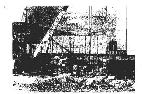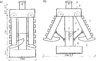 Рис. 23. Конструкция бурового уширителя: а - закрытое положение уширителя; б - открытое положение уширителя; 1 - буровая телескопическая стойка (штанга); 2 - ножи уширителя; 3 - плиты для зачистки забоя; 4 - ковш для срезаемого грунта; 5 - отверстия для фиксирующих «пальцев»; 6 - стыковочный узел; 7 - траверса Разбуривание уширения производят в несколько этапов. Каждый этап выполняется до полного раскрытия ножей, соответствующего заданному диаметру этапа уширения (в соответствии с фиксированным вставным пальцем). После завершения каждого этапа уширитель извлекался из скважины на поверхность грунта для разгрузки разбуренного грунта из приемного ковша. Следует имен, в виду, что работа ротора гидравлической системы бурения вхолостую указывает на завершение этапа разбуривания. Перед началом следующего этапа уширения следует проверить отметку забоя. Превышение этой отметки над проектной более, чем на 10 см свидетельствует о наличии осадки грунта в забое, который необходимо удалить. Очистка забоя производится с помощью приемного ковша, который забуривают до проектной отметки забоя. При этом приемный ковш закрепляют с помощью вставного пальца на основном корпусе уширителя. При переходе от этапа к этапу разбуривания заданный диаметр уширения фиксируется введением вставного пальца в конструкцию уширителя. Когда достигнут заданный проектный диаметр уширения, зачистку забоя от осадки грунта осуществляют троекратно. Установка арматурного каркаса производится так, чтобы он не входил в зону уширения сваи. Специальные конструктивные меры применяются для предотвращения самопроизвольного подъема каркаса в процессе бетонирования сваи. Работы по установке арматурного каркаса и последующему бетонированию скважины с уширением должны осуществляться сразу же после ее проходки в течение последующих 12 ч. Бетонирование скважины с уширением выполняют методом ВПТ со скоростью не ниже 5 пог.м/ч. При этом положение нижнего конца бетонолитной трубы должно находиться в слое укладываемого бетона на глубине от 2 до 5 м. В процессе бетонирования сваи следует контролировать уровень глинистого раствора и обеспечивать его соответствие заданным параметрам. Требования к бетонной смеси для буронабивных свай Несхватываемость (жизнеспособность) бетонной смеси должна обеспечиваться в течение не менее 3 ч. Такое время соответствует наибольшей продолжительности технологического цикла работы со смесью, что включает время ее доставки с завода-изготовителя и укладку в скважину, которое не должно превышать 60-90 мин. Осадка стандартного конуса бетонной смеси для свай должна быть в пределах от 16 до 22 см. Оптимальной следует считать осадку, равную 1 8 см. Параметры бетонной смеси гарантируются заводом-изготовителем за счет использования материалов, соответствующих утвержденному регламенту, и введения добавок ЛСТ-Е по ОСТ 13-183-83 и СНВ по ТУ 81-05-75-74 или КТП по ОСТ 13-145-82. При сокращении технологического цикла работы с бетонной смесью до 1,5 ч допускается применять добавку С-3 по ТУ 6-360204229-625-90. Применение добавок, содержащих соли натрия или хлора, не допускается. Введение добавок в бетонную смесь после отпуска с завода-изготовителя запрещается. 5.6. Подсистема «технология устройства буронабивных свай методом НПШ - механизация»Опыт применения цилиндрических железобетонных