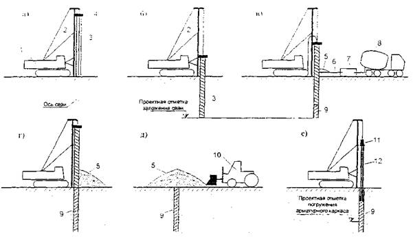 Рис. 24. Схема технологического процесса по устройству буронабивных свай методом НПШ: а - центровка и установка в вертикальное положение шнека буровой машины; б - забуривание шнека до проектной глубины; в - подъем шнека с извлечением грунта и одновременным бетонированием скважины; г - извлечение шнека из скважины и окончание ее бетонирования; д - зачистка устья скважины; е - погружение арматурного каркаса; 1 - буровая машина на раздвижном гусеничном ходу; 2 - направляющая мачта; 3 - непрерывный шнек; 4 - лебедка; 5 - извлеченный из скважины грунт; 6 - бетоноводные трубы; 7 - бетононасос; 8 - бетоновоз; 9 - подвижная бетонная смесь; 10 - погрузчик; 11 - вибропогружатель; 12 - арматурный каркас В состав подготовительных работ входят: организация и устройство рабочих площадок, технологических проездов, мест размещения и складирования рабочих материалов, оборудования и инструментов; выноска реперов с разбивкой и закреплением свай с привязкой их к существующей геодезической сети; доставка на место работы, установка в рабочее положение и обустройство бурового агрегата, проверка вертикальности мачты в соответствии с инструкцией по его содержанию и эксплуатации; доставка остальных единиц и узлов оборудования (например, бетононасоса, погрузчика, бетоноводов, вибратора) и их пробный запуск; подача на стройплощадку бетонной смеси в количестве 120% от объема одной сваи; подача на стройплощадку арматурного каркаса. Подбор состава и приготовление бетонной смеси должны соответствовать требованиям СНиП 3.02.01-87, СНиП 3.06.04-91, ГОСТ 7473-94 и «Рекомендациям по проектированию и устройству буровых свай методом НПШ», разработанным ОАО «ЦНИИС». Бурение скважины шнековым буром осуществляют в следующей технологической последовательности. Сначала производят пробную подачу бетонной смеси через бетононасос, бетоноводные рукава и шнек буровой машины. Затем затвор бетоновода (центральной трубы) на шнеке внизу закрывают. После этого производят корректировку работы бортового компьютера в режиме «Программирование» и включение позиции «Бурение» (рис. 25).