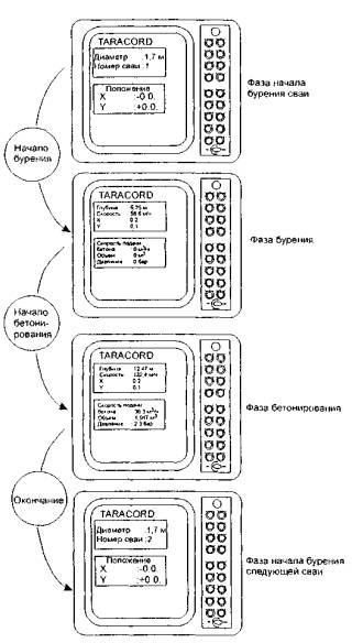 Рис. 25. Изображения экрана монитора в различных режимах работы Погружение шнека в грунт осуществляют посредством завинчивания до проектной отметки, причем давление на шнек должно быть только вниз. По мере опускания шнека выполняют перекладку бетоноводного рукава. Процесс бетонирование сваи компьютеризирован. После включения на компьютере позиции «Бетонирование» (см. рис. 25) производится подача бетонной смеси бетононасосом в скважину через бетоноводы и шнек буровой машины с одновременными подъемом шнека и очисткой его чистильщиком от грунта и перекладкой бетоновода погрузчиком по площадке по мере подъема шнека. Нагнетание бетонной смеси под извлекаемый шнек осуществляется с интенсивностью, обеспечивающей давление ее под шнеком не менее 2 атм. После достижения бетоном проектной отметки верха сваи подача бетона прекращается. Перед установкой арматурного каркаса производят отвод буровой машины от скважины, извлекают грунт, скопившийся над ней с помощью погрузчика, зачищают вручную устья скважины с удалением шламового слоя бетона сваи. Далее выполняют подъем арматурного каркаса лебедкой буровой машины и подачу его к скважине. Опускание арматурного каркаса в свежий бетон скважины осуществляется под собственным весом. Погружения каркаса в бетон сваи до проектной отметки производят с помощью вибратора, который устанавливается на выпусках арматуры с помощью лебедки буровой машины. Минимальное время, в период которого необходимо провести данную работу, не должно превышать 1,5 ч. По завершении погружения вибратор снимают посредством лебедки. Особенности производства работ в зимних условиях Особенности производства работ в зимних условиях зависит от температуры воздуха во время выполнения тех или иных технологических операций по сооружению свай. При температуре воздуха от +5 до -5°С необходимо утеплить бетононасос и металлический верх бетоновода. Бетонная смесь для нагнетания должна быть подогретой до температуры +5-+10°С. При температуре воздуха от -5 до -15°С, кроме мероприятий, указанных выше, подогрев бетонной смеси необходимо доводить до температуры +10°С. При температуре воздуха от -15 до -25°С следует выполнять те же предписания, которые рекомендованы для диапазона температур воздуха от +5 до -5°С, при этом температура подаваемой в скважину бетонной смеси должна быть доведена до +12°С. При температуре воздуха ниже -25°С, кроме условий, указанных для диапазона температуры от -15 до -25°С, температуру бетонной смеси, нагнетаемой в скважину, следует доводить до +15°С. При промерзании грунта на глубину более 50-60 см необходимо предварительно разработать лидерную скважину по диаметру сваи прогревом либо вручную пневмомолотками. Промывку бетоноводов производят теплой водой. Следует также предусматривать прогрев бетононасоса и емкости для хранения предварительно завезенной бетонной смеси, включая миксеры. При температуре воздуха ниже -18°С перед опусканием арматурного каркаса его необходимо прогреть до положительной температуры во избежание намораживания на него бетонной смеси после опускания каркаса в скважину. Оголовки свай после окончания бетонирования и установки арматурного каркаса следует тщательно утеплить. Нормы затрат времени на работу буровой установки «Casagrando» на бурение и бетонирование скважины диаметром 0,