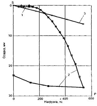 Рис. 28. График зависимости S = f(P) осадки сваи от нагрузки по результатам статического испытания: 1 - мгновенная осадка; 2 - осадка после выдержки нагрузки; 3 - упругая осадка В испытаниях ударной нагрузкой в верхней части сваи (на расстоянии не менее двух диаметров от торца) устанавливают комбинированные датчики, фиксирующие следующие динамические параметры (рис. 30): - ускорение - скорости волн деформаций (посредством акселерометра); - нормальные силы или истинную энергию удара (посредством тензодатчика VW Strain Gauge).