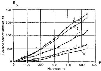 Рис. 29. График сопротивления сваи по боковой поверхности в зависимости от нагрузки при статическом испытании Rb = f(P, h) на глубине: 1-1 м; 2-2м; 3-3 м; 4-4 м; 5-5м Обычно статические и динамические испытания проводят на разных сваях, вблизи расположенных. Динамические параметры регистрируются аналого-цифровой системой FPDS-6, которая обрабатывает сигналы для их дальнейшего компьютерного анализа. Пример сигналов силы и ускорения, получаемых с комплекса FPDS-6, дан на рис. 31. В теоретическом аспекте метод базируется на одномерной волновой теории цилиндрического стержня, находящегося в упругой инерционной среде, которая обладает как свойством упругости, так и демпфирующей способностью.