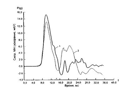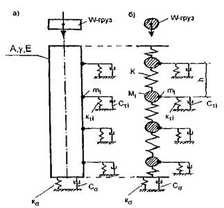Рис. 31. Графики зависимости силы и ускорения при ударе от времени: 1 - сила; 2 - ускорение Наиболее общий вид динамической расчетной схемы системы «свая - грунт» показан на рис. 32, а, где грунт представлен дискретной моделью. Стержень (свая) характеризуется площадью поперечного сечения (А), объемным весом материала (g); модулем упругости материала (Е). Грунт в расчетной схеме представлен следующими параметрами: m1 - присоединенная к стержню масса грунта, учитывающая его свойства инерции; кτi - коэффициент жесткости пружины, моделирующей деформации сдвига грунта; Cτi - коэффициент затухания (демпфирования) деформаций сдвига по грунту; кσ - коэффициент жесткости пружины, моделирующей деформации сжатия грунта; Сσ - коэффициент затухания (демпфирования) деформаций сжатия грунта.