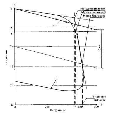 Рис. 33. Определение несущей способности сваи по результатам динамических испытаний (за истинное принимается наибольшее значение, найденное по трем методам): 1 - осадка (динамическое испытание); 2 - упругая деформация сваи По методу «шести мм» несущая способность сваи определяется абсциссой точки пересечения горизонтальной прямой, находящейся на уровне 6 мм от начала графика «осадка - нагрузка», с самим графиком. По методу касательных несущая способность сваи вычисляется абсциссой точки пересечения касательных, проведенных к началу и наибольшему наполнению графика «осадка - нагрузка». По методу Дэвиссона несущая способность сваи определяется абсциссой точки пересечения прямой, параллельной линии упругой осадки сваи и расположенной в 10 мм от начала графика «осадка - нагрузка», с этим графиком. За истинную (реальную) несущую способность сваи по грунту в методе «Элди» принимается наибольшее значение, рассчитанное по программе ELDI WAVE SIGNAL MATCH. Кроме того, расчетом вычисляются составляющие несущей способности сваи по грунту (по боковой поверхности и ее торцу). Таблица 10