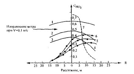 Рис. 36. Распределение концентрации диоксида азота СNO2 под мостовым сооружением и на открытом месте в зависимости от расстояния и высоты над полотном дороги, измеренной: 1, 2, 3 - на открытом участке; 4 - под путепроводом на высоте 1,5 м; 5 - то же, 3 м; 6 - то же, 5 м; 7 - теоретически на высоте 2м. По данным обследований мостов в Великобритании, установлено, что после 20-30 лет эксплуатации концентрация хлоридов в элементах характеризуется уровнем 0,3-0,5%, а локально достигает 2% и более. Образно воздействие агрессивных агентов внешней среды на железобетонные конструкции мостов представлено на рис. 37, где диоксид углерода (СО2), ионы хлора (Сl), кислород (O2) и вода (Н2O) проникают в бетон по порам, а в случае раскрытия трещин в бетоне перечисленные агенты вместе с диоксидом азота (NO2) получают доступ непосредственно к арматуре.