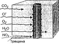 Рис. 37. Воздействие агрессивных агентов внешней среды на железобетонные конструкции Попеременное замораживание и оттаивание материала конструкций, как правило, усиливает агрессивное воздействие внешней среды, поэтому необходимо разрабатывать комплекс мероприятий для обеспечения долговечности железобетонных конструкций. Надежность и долговечность мостов и путепроводов в значительной степени определяются коррозионным состоянием материалов конструкции. Как показывает опыт эксплуатации, для железобетонных пролетных строений наиболее характерным является поражение коррозией стальной арматуры. В зависимости от химико-технологических особенностей стали, ее напряженного состояния, защищенности поверхности бетоном в пролетных строениях и среды происходит, в основном, два вида коррозионных поражений. Первый имеет место в ненапрягаемых арматурных элементах из малоуглеродистой стали и представляет собой равномерную по поверхности коррозию, протекающую во времени со снижением площади сечения арматурного элемента и нарастанием слоя продуктов коррозии, за счет чего может произойти разрушение защитного слоя бетона. На рис. 38 представлены обобщенные опытные данные из ВСН 32-89 о степени развития коррозии арматуры в зависимости от раскрытия трещин в бетоне. Второй вид поражений - коррозионное растрескивание (КР) - характерен для напрягаемых арматурных элементов из высокопрочной углеродистой и стержневой термомеханически и термически упрочненной стали. КР имеет место, когда под напряжением происходит растрескивание поверхностной оксидной пленки и зарождение трещины в зоне концентрации напряжений с ее развитием во времени, результатом которого может стать хрупкий разрыв элемента. Механизм развития этих видов поражений различен. Общим является то, что электрохимические процессы обоих видов протекают при воздействии агрессивной среды.