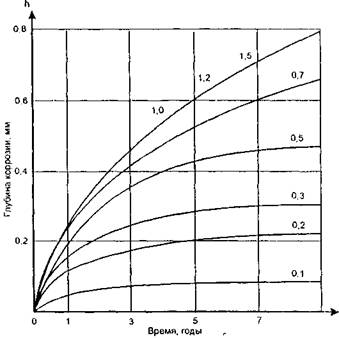 Рис. 38. Развитие коррозии арматуры в трещинах железобетонных конструкций (цифры на кривых - ширина раскрытия трещин, мм) Для предварительно напряженных пролетных строений наибольшую опасность представляет хрупкое разрушение от коррозионного растрескивания (ХРКР) высокопрочной арматуры. Являясь несущим элементом конструкции, напрягаемая арматура работает в чрезвычайно жестких условиях, испытывая физико-механические воздействия, вызывающие повреждения поверхности, уже в процессе предмонтажных и монтажных операций. Если химический состав и технология обработки арматурной стали обеспечиваюг выполнение нормативных требований по ее стойкости к КР в состоянии поставки, то к моменту эксплуатации или даже инъецирования стойкость против КР может оказаться сниженной и процесс КР, начавшийся до и в монтажный период, может продолжиться и после инъецирования во время эксплуатации моста. Тогда агрессивные агенты в виде влаги, газов, водных растворов кислот и солей могут проникнуть к находящейся внутри конструкции напряженной арматуре через микро- и макротрещины, поры, капилляры защитного слоя. 6.2. Нормативные требования по обеспечению долговечности железобетонных конструкцийОсновными факторами, определяющими долговечность железобетонных конструкций, являются: - защитный слой арматуры или преднапряженных пучков (канатов), при этом имеет значение толщина защитного слоя и качество бетона; - водоцементное отношение в бетонной смеси (верхний предел этого отношения ограничивают, поскольку с увеличением его повышается способность агрессивных агентов проникать в бетон); - содержание цемента в бетонной смеси (нижний предел содержания цемента ограничивают, что повышает сопротивляемость бетона против проникания хлоридов и углекислого газа); - нормативная прочность бетона на сжатие в возрасте 28 сут. (минимальное значение прочности при соблюдении указанных выше требований устанавливают по водоцементному отношению и содержанию цемента). Сопоставление показателей, приведенных выше, по нормам различных стран дано в табл. 13, 14. Требования к цементу определяют на основании соответствующих ГОСТов. Рассмотренные выше факторы не исчерпывают все требования для обеспечения долговечности железобетонных конструкций, поскольку климатические условия и степень агрессивности окружающей среды вносят свои коррективы. Для элементов мостов, периодически подвергающихся увлажнению, замораживанию и оттаиванию, воздействию солей (агентов) антиобледенительных смесей существуют нормативные значения по водонепроницаемости, морозостойкости, содержанию в бетонной смеси воздуха. В нормативных документах последнего поколения (например, MГCH 5.02-99) ужесточены требования по морозостойкости и водонепроницаемости для железобетонных мостовых конструкций. Сравнение требований MГCH 5.02-99 и СНиП 2.05.03-84* по этим показателям представлено в табл. 15. На основании требований к бетону мостовых конструкций по СНиП 3.06.04-91, Еврокоду 2 и норм ENV 206, представленных в табл. 14, можно отметить следующее. По минимальному расходу цемента требования указанных СНиПа и Еврокода близки для элементов мостового полотна и элементов в зоне переменного уровня воды (290 кг/м3 и 300 кг/м3 соответственно). Для остальных элементов нормы СНиПа ниже нормы Еврокода (230-260 кг/м3 против 300 кг/м3). Ма