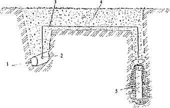 Рис. 39. Катодная (протекторная) защита погруженного трубопровода с использованием магниевого анода: 1 - погруженный стальной трубопровод с покрытием; 2 - термитная сварка; 3 - изолированная проволока; 4 - грунт; 5 - магниевый анод, предварительно помещенный в меток из пористой ткани, заполненный бентонитной глиной Для реализации метода имеются серийные технология и оборудование, а также универсально-сборные приспособления и транспортные средства, разработанные фирмой «Элгад». В качестве расходуемых анодов используется цинк или его сплавы. Энергетические характеристики этих сплавов представлены в табл. 16.