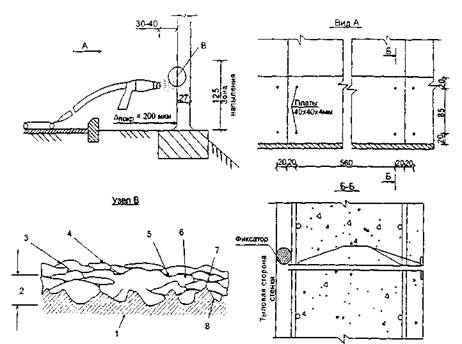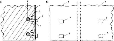 Рис. 40. Катодная (протекторная) защита железобетонной конструкции с использованием напыленного цинкового анода: а - поперечное сечение; б - фасад; 1 - бетон; 2 - арматура; 3 - стальные платы; 4 - напыленный цинковый анод; 5 - электрический проводник; 6 - токи защиты
