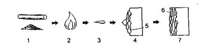 Рис. 41. Общая схема процесса термического напыления: 1 - твердый или порошковый напыляемый материал; 2 - электрический или газовый источник тепла расплавляет материал; 3 - движение расплавленных частиц ускоряется; 4 - частицы сталкиваются с подслоем и расплющиваются; 5 - очищенный подслой, которому придана шероховатость; 6 - оксидные включения; 7 - законченное покрытие Термическое напыление - гибкий процесс, что весьма существенно для работы в полевых условиях, так как позволяет получать покрытия в широком диапазоне требуемых толщин в зависимости от условий эксплуатации конкретной части сооружения. Термическое напыление повышает адгезию последующего нанесения лакокрасочных покрытий, а также способствует лучшей адгезии гидроизоляционных материалов, что весьма существенно в случае защиты ортотропных плит стальных пролетных строений и одежды ездового полотна. В этом случае допускается увеличение технологического перерыва между окончанием нанесения покрытия и слоя гидроизоляции до 24 ч. Кроме этого, возможно исключение процесса грунтовки в качестве подслоя для гидроизоляции. Метод термического напыления заключается в распылении струей сжатого воздуха расплавленных частиц покрытия, которые в момент столкновения с поверхностью расплющиваются и покрывают тонкой непрерывной пленкой подготовленную поверхность. Частицы охлаждаются, приобретая структуру литого материала.