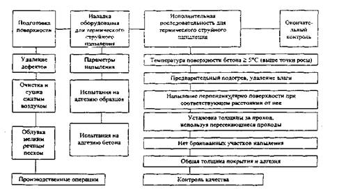 Теоретическая величина износа покрытия при особо сложных климатических и эксплуатационных условиях составляет 12,4 мкм в год. Методы нанесения покрытия Наиболее распространенным и эффективным способом нанесения покрытия является термическое струйное напыление. Упрощенная общая ее технологическая схема приведена на рис. 41, а структурная схема - на рис. 42. Термическое напыление реализуется тремя способами: дуговым, газовым и плазменным. В последние годы разработаны методы лазерного и лазерно-плазменного напыления, однако в строительной индустрии они не имеют в настоящее время практического применения.