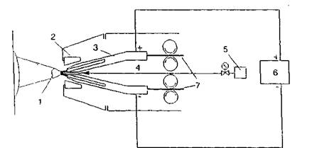 Рис. 43. Система газоснабжения: 1 - дуга; 2 - распылительная форсунка; 3 - контактная форсунка; 4 - распылительный газ; 5 - подача распылительного газа; 6 - блок питания; 7 - материал покрытия Обычное комплектование установки включает