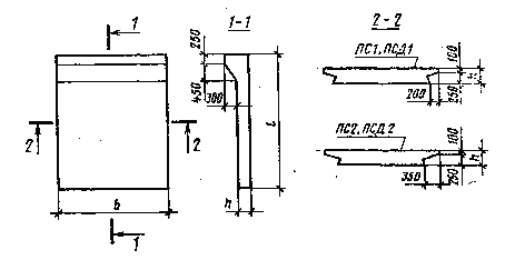 Постановлением Государственного комитета СССР по делам строительства от 18 марта с 01.01.86 Несоблюдение стандарта преследуется по закону Настоящий стандарт распространяется на сборные железобетонные конструкции, изготовляемые из тяжелого бетона по типовой проектной документации серии У-01-01/80 и предназначенные для заглубленных помещений гражданской обороны (убежищ) классов А-II-А-IV с перекрытием балочного типа., Конструкции предназначены для применения: в сухих и водонасыщенных грунтах; при расчетной температуре наружного воздуха (средней температуре воздуха наиболее холодной, пятидневки района строительства согласно СНиП 2.01.01-82) до минус 40°С включительно; в несейсмических районах, а также в зданиях с расчетной сейсмичностью до 8 баллов включительно; в грунтах и грунтовых водах с неагрессивной степенью воздействия на железобетонные конструкции. Допускается применять конструкции при расчетной температуре наружного воздуха ниже минус 40°С, а также в грунтах и грунтовых водах с агрессивной степенью воздействия на железобетонные конструкции при соблюдении дополнительных требований, установленных проектной документацией на конкретное помещение (согласно требованиям СНиП 2.03.01-84 и СНиП II-28-73) и указанных в заказе на изготовление конструкций. Показатели технического уровня, установленные настоящим стандартом, предусмотрены для конструкций высшей и первой категорий качества. 1. ТИПЫ, ОСНОВНЫЕ ПАРАМЕТРЫ И РАЗМЕРЫ1.1. Конструкции подразделяют на следующие типы: ПС - основные стеновые панели; ПСД - доборные стеновые панели; Б - балки перекрытия; П - плиты перекрытия. 1.2. Форма и основные размеры конструкций, а также их показатели материалоемкости должны соответствовать указанным на черт. 1-3 и в табл. 1. Стеновые панели типоразмеров ПС1, ПС2, ПСД1 и ПСД2