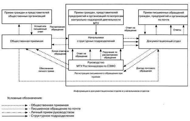 Методические рекомендации по организации работы Общественной приемной по обращению граждан и представителей общественных организаций разработаны впервые с учетом опыта работы Общественной приемной МТУ Ростехнадзора по СЗФО с целью оказания помощи руководителям, заместителям руководителей, начальникам отделов и ответственным сотрудникам по работе с обращениями граждан территориальных управлений Ростехнадзора по СЗФО в организации выполнения Федерального закона Российской Федерации от 02.05.2006 г. № 59-ФЗ. Данные методические рекомендации разработаны руководителем Общественной приемной МТУ Ростехнадзора по СЗФО Рубиным А. А. Состав редакционной комиссии: 1. Заместитель руководителя МТУ Ростехнадзора по СЗФО Шерстюк СР. - председатель; 2. Начальник отдела правового обеспечения Клещев С. П.; 3. Начальник контрольного отдела Скоков С. Н. Граждане Российской Федерации имеют право обращаться лично, а также направлять индивидуальные и коллективные обращения в государственные органы и органы местного самоуправления. (Статья 33 Конституции Российской Федерации) Общественная приемная является органом по обеспечению обращений граждан при Межрегиональном территориальном управлении технологического и экологического надзора Федеральной службы по экологическому, технологическому и атомному надзору по Северо-Западному федеральному округу (далее - Общественная приемная МТУ Ростехнадзора по СЗФО) и организована с целью дальнейшего совершенствования и повышения эффективности работы по обеспечению реализации прав граждан на обращение в Федеральную службу по экологическому, технологическому и атомному надзору и находящихся в ее ведении организаций в соответствии с положениями Федерального закона «О порядке рассмотрения обращений граждан Российской Федерации» от 02.05.2006 г. № 59-ФЗ. Общественная приемная МТУ Ростехнадзора по СЗФО входит в единую сеть Общественных приемных Федеральной службы по экологическому, технологическому и атомному надзору. Правоотношения по реализации гражданами Российской Федерации их конституционного права на обращение в органы государственной власти регулирует Регламент работы Общественной приемной МТУ Ростехнадзора по СЗФО. В своей деятельности Общественная приемная руководствуется Конституцией Российской Федерации, федеральными конституционными законами, федеральными законами, актами Президента Российской Федерации и Правительства Российской Федерации, нормативно-правовыми актами Федеральной службы по экологическому, технологическому и атомному надзору, Положением МТУ Ростехнадзора по СЗФО и Регламентом Общественной приемной. Руководящие документы, на основании которых создана и работает Общественная приемная: 1. Федеральный закон № 59-ФЗ от 02.05.2006 г. «О порядке рассмотрения обращений граждан Российской Федерации». 2. Распоряжение № 34-рп от 26.06.2006 г. «О дальнейшем совершенствовании работы Федеральной службы по экологическому, технологическому и атомному надзору и находящихся в ее ведении организаций с обращениями граждан в соответствии с требованиями, изложенными в поручении Президента Российской Федерации В. В. Путина от 3 марта 2006 г. № Пр.-331 3. Приказ № 625 от 27.06.2006 г. «О порядке рассмотрения обращений граждан в центральном аппарате, территориальных органах Федеральной службы