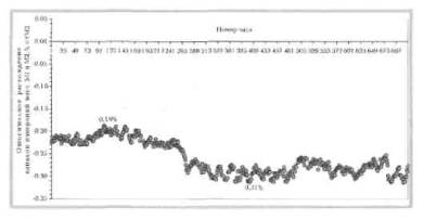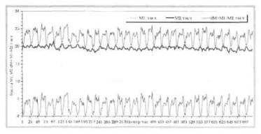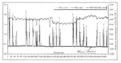 Рис. 3. Изменение во времени измеренных часовых масс M1 и М2 и их разности dM=M1-M2 на тепловом вводе жилого дома На рис. 3 показано, каким образом изменялись измеренные часовые массы (среднечасовые расходы) M1 и М2 и их разности dM=M1-M2 на тепловом вводе жилого дома в течение месяца, а на рис. 4 приведена зависимость допускаемой относительной погрешности измерения разности масс М1-М2 от времени суток.