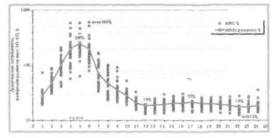 Рис. 4. Изменение допускаемой погрешности измерения разности часовых масс M1 и М2 от времени суток Рис. 4 убедительно свидетельствует о том, что даже при наличии в жилом доме сравнительно большого отбора теплоносителя в систему ГВС точность измерений разности масс М1-М2 весьма невысока. Максимальные (вечерние) часовые объёмы потребления горячей воды здесь измерены со средней погрешностью 18%, утренние и дневные разности масс измеряются с погрешностью 19-22%, а допускаемая погрешность незначительных (ночных) величин dМ=М1-М2 составляет сотни процентов. Расчеты показывают, что в данном случае даже при наличии довольно значительного среднего относительного водоразбора (Мгвссред = 14,7% от M1) средневзвешенная допускаемая погрешность измерения разности масс (за 720 часов измерено dМ=М1-М2=2422 т) в данном ЖСК составила ±25%, т.е. результат измерений следует записать как dM=2422 ± 611 т. Конечно же, погрешность результатов коммерческого учета в ±25% не может считаться приемлемой ни для потребителя, ни для поставщика. Однако эту погрешность можно уменьшить без труда в 12,5 - 25 раз (с 25% до 1-2%), применив в данном узле учета для подсчета теплопотребления формулу (5) вместо формулы (4) и отказавшись от попытки измерять полезное потребление горячей воды и возможную утечку теплоносителя как разность масс М1-М2. Поэтому крайне важно, чтобы в новых «Правилах учета тепловой энергии» было обращено внимание на проблему недопустимо низкой точности измерения разности масс на тепловых вводах потребителей и была бы «узаконена» формулу (5) для ведения коммерческого учета тепловой энергии и теплоносителя. Журнал «Энергонадзор-информ» № 3 2007 г.