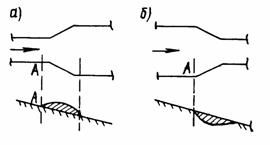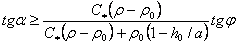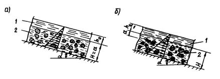 Рис. 3. Соотношение между сдвигающими и удерживающими напряжениями на уклонах: а - превышающих критическое значение; б - не превышающих критическое значение; 1 - водный поток; 2 - рыхлообломочная порода Во второй ситуации (рис. 3,б) сдвиг рыхлообломочных пород может наблюдаться и на уклонах, меньших, нежели это следует из уравнения (1), если влияние поверхностного потока на величину результирующего напряжения становится весомым. Значение угла, при котором происходит сдвиг рыхлообломочных пород в слое толщиной α, определяется из уравнения: