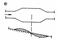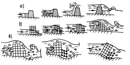 Рис. 1. Отложение наносов и размыв дна русла в зависимости от профиля русла в плане: а - расширение русла; б - сужение русла; в - русло периодического плана Селевые потоки могут иметь турбулентный и ламинарный характер движения. Характерной особенностью перемещения твердой фазы в составе грязекаменных селей является равномерность распределения частиц по глубине потоков. Причиной такого распределения может служить турбулентное перемешивание смесей. Характерной особенностью ламинарных течений является параллельность движения слоев жидкости в потоке, причем скорость течения по глубине потоков неодинакова: от нулевого значения на дне потока до максимального вблизи его поверхности. Несвязные селевые потоки могут двигаться только в турбулентном режиме и подчиняются законам гидравлики, а связные движутся как в турбулентном, так и в ламинарном режимах, т.е. не подчиняются законам гидравлики, а течение протекает как в вязкопластических средах, например, как бетонный раствор. Связный (структурный) селевой поток содержит 80 - 90 % обломков горных пород, средняя плотность (ρс) которых от 2000 до 2300 кг/м3. Несвязный селевой поток содержит 15 - 60 % твердых материалов, средняя плотность его 1100 - 1600 кг/м3 (рис. 2).