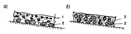 Рис. 2. Структурно-реологические типы селей: а - несвязный (водокаменный, наносоводный); б - связный грязекаменный); 1 - вода или суспензия; 2 - обломочный материал; 3 - грязевая масса Остановившись, структурный поток не отдает свободную воду и, не сортируя влекомый материал, застывает на месте, а турбулентный поток по пути стекания откладывает сносимый материал с определенной сортировкой по крупности. В 1980 г. Ю.Б. Виноградов предложил группировать селевые потоки в зависимости от состава и плотности селевой массы на наносоводные (ρс = 1100 - 1600 кг/м3), грязевые (ρс = 1400 - 2000 кг/м3) и грязекаменные (ρс = 1800 - 2500 кг/м3) [4]. Селевые потоки имеют большую вязкость (внутреннее сопротивление жидкости при движении одного ее слоя по другому). Благодаря значительной плотности и большой вязкости селевые потоки удерживают в себе крупные валуны. Из моделей селеформирования наибольшую известность приобрели модели Ю.Б. Виноградова и Т. Такахаши [5]. Т. Такахаши рассмотрены схемы формирования селевых смесей в двух ситуациях: рыхлообломочные порода, не обладающие сцеплением, залегают на неразрушенном основании на уклонах, близких к углам естественного откоса; толстый слой рыхлообломочных пород (также не обладающих сцеплением) залегает на относительно небольшом уклоне. В первой ситуации (рис. 3,а) сдвиг рыхлообломочных пород происходит при полном или частичном заполнении порового пространства водой.