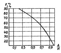 где Δ - минимальный размер ячеек в вертикальной плоскости; Н - высота потока; V - средняя скорость потока. На рис. 4 представлено графическое определение силы удара о сквозное сооружение в зависимости от соотношения Δ/Н. Например, требуется определить силу удара связного селевого потока о сквозное противоселевое сооружение с вертикальной напорной гранью при глубине потока Н = 5 м, ширине русла В = 50 м, средней скорости движения селевого потока 5 м/с, объемном весе γС = 2,0 т/м3, размер ячеек сквозного сооружения равен 0,8×2 м2, коэффициент сквозности 0,6.