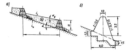 Рис. 5. Регулирующие мероприятия на склонах: а - ступенчатая терраса; б - то же, с валами; в - порог К наиболее распространенному типу сооружений в мировой практике, обеспечивающих постепенное затухание селевого потока, относится система барражей-запруд, возводимых выше защищаемых объектов дороги. Барражи, в отличие от порогов, строятся выступающими над дном оврага (рис. 6). Расстояние L между барражами определяется по формуле: