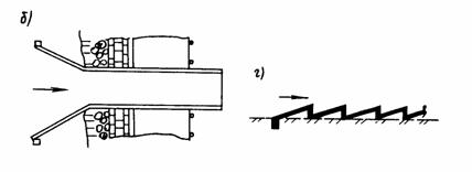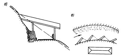 К сожалению, до настоящего времени измерения ударной силы селевых потоков в естественных условиях не производились. 3. СЕЛЕЗАЩИТНЫЕ СООРУЖЕНИЯ3.1. Способы защиты дорог от селевых потоковМероприятия по защите народнохозяйственных объектов и дорог можно разделить на четыре группы: предотвращение зарождения селей; пропуск транзитом селей над или под защищаемыми дорогами, полная и частичная аккумуляция (заполнение емкости) селей выше защищаемой дороги. Первая группа селезащиты - предотвращение возникновения селей - практикуется с давних времен, она более простая, так как не требует строительства специальных селеаккумулирующих емкостей. Суть ее заключается в уменьшении размыва и исключении перерастания незначительного водного течения по склону в мощный наносоводный или грязекаменный поток. В этой группе более распространенным способом защиты являются лесонасаждения на горных склонах, которые замедляют образование оврагов. Кроме того, корни деревьев хорошо укрепляют почву от размыва и защищают горные породы от выветривания. Однако следует отметить, что по климатическим условиям во многих местах лесонасаждения невозможны, их произрастание ограничено предельной высотой распространения лесов на скалистых склонах гор. Кроме того, для выращивания леса и до получения устойчивого лесного массива требуется значительное время. В мировой практике для уменьшения активности проявления селевых потоков часто на крутых склонах устраиваются ступенчатые террасы параллельно одна другой на расстоянии 15 - 20 м с валами и без них. Склон превращается как бы в пологую лестницу, благодаря чему замедляется скорость стекания воды и задерживаются камни (рис 5 а, б). Для предотвращения размывов русла и приведения крутых уклонов в ступенчатый вид часто практикуются заграждения русел горных потоков подпорными стенами в виде порогов. Порог - это поперечная стена, расположенная по ширине русла горного потока, опущенная в грунт русла на всю высоту (рис. 5, в).