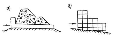 Рис. 8. Гидротехнические сооружения: а - глухая плотина с водосбросам; б - сквозной селеуловитель Однако они трудоемки и неэкономичны, так как после прохождения каждого крупного селя необходимо возобновлять резервную емкость путем наращивания старой или строительства новой плотины, либо очистки селехранилища. Кроме того, материал плотины фильтрует воды и подвержен растворению или выщелачиванию. Все это особенно опасно в сейсмоактивных районах, так как в теле плотины могут появиться трещины, сдвиги. Большие плотины нарушают экологический режим региона, изменяют направление ветра или затормаживают их движение, создавая непроветриваемую зону ниже плотины. Для освобождения потока от наносов, когда сель переносит крупные валуны, копают котлованы, карманы больших размеров, называемые наносоуловителями. Проходя через такой наносоуловитель, поток откладывает переносимые им камни и движется дальше, лишенный наиболее опасных средств разрушения. Для борьбы с селевыми потоками в Узбекистане широко распространены насыпные, укатанные земляные плотины, высота которых не превышает 15 м. К четвертой группе можно отнести сквозные сооружения из стержневых конструкций (рис. 8, б). Основное назначение сквозных сооружений - задержание крупных фракций селевого потока, уменьшение объема, плотности и скорости селя, пропуск легких фракций в нижний бьеф. Мелкие наносы (булыжники, песок, глина) используются как основной материал для изготовления элементов строительных конструкций, покрытий автомобильных дорог и т.д. Отложения селевых наносов в пределах сооружения, а также сам поток, протекая через сооружение и загружая его, увеличивают устойчивость на опрокидывание и сдвиг. По мере заполнения верхнего бьефа наносами уменьшается скорость потока, а следовательно, и динамическое давление на сооружение. Сквозные конструкции более дешевы, чем массивные сплошные сооружения, поэтому возможность их использования и привлекает к себе внимание проектировщиков. Селезадерживающие сквозные сооружения из сборного железобетона позволяют индустриализировать строительные работы и получить значительный экономический эффект. Обладая малым коэффициентом строительной застройки (0,07 по объему), сборно-решетчатые конструкции имеют в то же время довольно значительный коэффициент гидравлической сплошности. Изготовление отдельных элементов сборно-решетчатых конструкций довольно просто, особенно в заводских условиях, где применяется инвентарная опалубка. Как правило, перевозка небольших по весу элементов конструкций не вызывает затруднений. Авторами таких стержневых сквозных сооружений являются И.И. Херхеулидзе [7], М.С. Гагошидзе [10] и Ж.Б. Байнатов [11, 12]. Разработанная система сооружения И.И. Херхеулидзе (ЗакНИГМИ) широко внедрена в Казахстане, Армении, Крыму и на Северном Кавказе, за рубежом - в Югославии. В мировой практике в последнее время применяют комплексные меры борьбы против селевых потоков: в верхнем течении строится водохранилище для перехвата наносов, в среднем течении - каскад небольших ловушек из запруд и в нижнем течении - канал для отвода селей. Наряду с упомянутыми выше противоселевыми сооружениями имеются также различные блоки и форменные элементы, изготовляемые из бетона или железобетона и применяемые в локальных условиях для ослаб