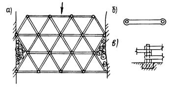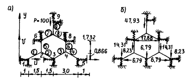 где С - жесткость на сдвиг двух соседних элементов, определяемая по формуле C = (σаАа + σбАб)/h [11]; Cу - средняя жесткость связей; h - толщина элемента. Пример. Выполняется расчет фрагмента сотовой горизонтальной фермы (одного яруса) селезащитного сооружения на действие одной сосредоточенной нагрузки Р = 100 т (рис. 34, а).