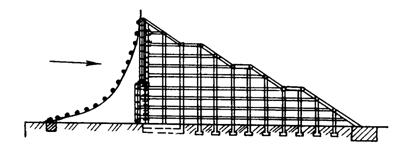 Рис. 20. Конструкция запруды повышенной устойчивости на сдвиг и опрокидывание Кроме того, каскад из двух сооружений, имеющих разные высоты и единую фундаментную часть, полностью исключает размыв основания и опрокидывание. Устраиваются также фильтрующие запруды, сквозные сооружения из металлических конструкций и из железобетонных элементов. С целью закрепления прирусловых участков используются отдельные форменные элементы из пространственных конструкций типа тетраэдра и сипая, укладываемых вдоль береговой полосы. Территория Югославии характеризуется сетью селеносных водотоков не слишком большой мощности [7]. В качестве противоселевых сооружений используются фильтрующие запруды (высотой до 10 м) системы С. Росича и ретардационные - С. Гавриловича. Они строятся из бетона или из каменной кладки на цементном растворе. Фильтрующие устройства представляют собой три продольных канала (главный и два боковых) сборно-решетчатой конструкции. Назначение сооружения - образовать мощные отложения в предбарражной пазухе. Из-за быстрого отделения воды от наносов на фильтрующих каналах уменьшается транспортирующая сила селевого потока, откладывающего крупные наносы непосредственно на решетках каналов. В дальнейшем эти крупные отложения на решетках должны служить как новая дренажная система, развивающаяся при следующих паводках. В теле ретардационной запруды предусмотрены большие отверстия (окна). Часть расхода потока под давлением проходит через отверстия, остальная часть - через водослив, что дает возможность расщепить поток на ряд струй, имеющих различные скорости на выходе. Так как каждая струя находится под разным гидротехническим давлением на выходе, верхняя струя задерживается по отношению к средней, средняя - к нижней. В Югославии также строятся земляные запруды высотой 4 - 7 м с бетонными трубами d = 1 м и запруды из сборных железобетонных элементов. В Австрии широко распространены гидротехнические сооружения, барражи бетонные сквозные и из каменной кладки [16]. Прямолинейные и слабоизогнутые в плане неармированные каменные и бетонные запруды выполняются на основе теории гравитационных стенок. Ширина гребня запруды равна 1 - 1,5 м, верховая грань вертикальная, уклон низовой грани 20 - 25 %. Длина пролета бетонных {прямолинейных в плане) запруд достигает 20 - 30 м; при больших пролетах запруды арочного очертания. Для уменьшения воздействия гидростатического давления высокие запруды строят в два этапа, причем ко второму этапу (наращиванию верхней трети) приступают только после полного занесения наносами ранее построенной части сооружений. Наиболее часто применяемые в Австрии запруды с горизонтальным расположением балок имеют просвет между элементами от 15 - 20 до 30 (100) см, высоту решетки 2,25 - 4 м; ширину 3,5 - 5,5 м. Решетки изготовляют из полосовой стали, труб, рельсов. Стоимость такого сооружения на 60 % дороже стоимости обычного гравитационного, однако его преимущество заключается в более легкой и быстрой очистке емкости от наносов, которую осуществляют скреперами, экскаваторами, фронтальными погрузчиками на гусеничном ходу и мощными автомобилями-самосвалами. Стоимость механизированной очистки составляет 9 - 21 шиллинг за 1 м3. В США, в основном, строятся крупные плотины высотой до 60 м, например, в районе г. Лос-Анжелеса построено 19 пло