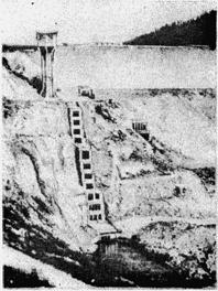 Рис. 13. Камненабросная плотина Медео с шахтным водосбросом (поперечный разрез) Емкость селехранилища составляет 12,6 млн. м3. При строительстве водосборных и водоприемных сооружений уложено 27 тыс. м3 железобетона. Общая стоимость строительства плотины составила 33,9 млн. р. В 1973 г. на плотину обрушился крупнейший ледниковый сель объемом 3,8 млн. м3 (сель века). Полное задержание его в селехранилище Медео спасло г. Алма-Ату от катастрофических разрушений. Плотина находилась в предельном состоянии, так как по телу плотины прошла сильная фильтрация воды. Общая схема размещения селезащитных сооружений в бассейнах рек Малой и Большой Алматинок г. Алма-Аты приводится на рис. 14.