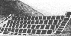 Рис. 19. Заграждение для улавливания крупных включений селевых потоков Между каркасами имеются сквозные отверстия. Стержни каркасов соединены между собой с помощью узловых листов и болтов. Расстояние между горизонтальными стержнями на нижнем участке заграждения меньше, чем на верхнем. Вертикальные стержни находятся на одинаковом расстоянии один от другого. Плотины для перехвата твердого стока селевых потоков наиболее широко применяются в Японии, где построено свыше 4 тыс. противоселевых плотин, т.е. в среднем одна плотина на каждые 70 км2 территории, не считая других мелких противоселевых сооружений и конструкции [15]. Показательным в этом отношении является бассейн селеносной р. Юкава, в котором размещены 12 крупных (высотой более 10 м) противоселевых бетонных плотин, а также низконапорные запруды и берегозащитные стены. В Японии предложены плотины повышенной устойчивости (рис. 20), состоящие из двух взаимосвязанных сооружений разной высоты. В процессе прохода селевых потоков пространство между плотинами заполняется материалом селя, что способствует повышению ее устойчивости.