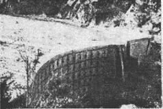 Рис. 16. Ячеистая селезадерживающая плотина на р. Большая Алматинка (вид с нижнего бьефа) Это сооружение выдержало крупный селевой поток объемом до 1 млн. м3 и максимальным расходом 1000 м3/с, который прошел 27 июня 1988 г. Жидкие составляющие этого селевого потока с расходом 30 - 40 м3/с сбрасывались по стабилизированному руслу через отстойники в котлованы озера Сайран. Начиная с 1841 г., по р. Большой Алматинке прошли около 10 селевых потоков различной мощности и происхождения (большинство ливневые). В 1988 г. Казселезащита внедрил в производство новую конструкцию селезащитного сооружения арочного типа (а.с. № 1182104). Арочная плотина высотой 6 м состоит из сборных клинообразных железобетонных блоков метровой высоты, уложенных по расчетной дуге, образующих сквозные отверстия диаметром 30 см, и из массивных опор на концах (рис. 17).