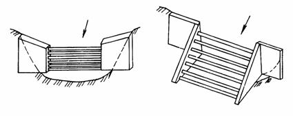 Арочное железобетонное сквозное сооружение на притоке Кокчек р. Большой Алматинки Конструкция может применяться и для устройства подпорных стен, малых архитектурных форм, в других сооружениях, где требуются повышенная надежность и экономичность, так как дает возможность уменьшить массу до 60 % по сравнению с неразрезной аркой. Арочные плотины построены в ущелье Кокчек на р. Большая Алматинка (один пролет), вблизи с. Кайназаровки Енбекшиказахского района (два сооружения по четыре пролета) и в с. "Красный Восток" Каскеленского района (три пролета). На основе результатов анализа разрушения плотин можно сделать вывод о том, что мелкие селезадерживающие сооружения из металлических форм, стоек и тросов оказались не эффективными не только против селя, но и против крупного наносонесущего паводка. Такие одиночные плоские селезадерживающие запруды эффективны в условиях малых селеопасных бассейнов, где формируются незначительные паводковые расходы до 20 м3/с. Эксплуатация селеуловителя на р. Акжар подтвердила высокую эффективность сборных пространственных железобетонных сооружений против селевых потоков с максимальным расходом до 50 м3/с. Из класса сквозных легких железобетонных сооружений по надежности работы, быстроте монтажа и экономичности выделяется сооружение, построенное в ущелье Кокчек на р. Большая Алматинка. Сооружение выдержало несколько натисков селевых потоков и в данное время (в течение одного года) полностью занесено наносами, при этом в теле сооружения не обнаружено никаких следов разрушений. Такие сооружения могут выдержать любые катастрофические селевые потоки. 3.3. Зарубежный опыт строительства селезащитных сооруженийНаиболее распространенным методом борьбы с уже сформировавшимися селевыми потоками является перехват твердого селевого стока на различных участках водотока путем строительства различных сквозных металлических и железобетонных конструкций селезащитных сооружений. Такие сооружения строятся либо в транзитной зоне, либо в верховьях, в створах, где может быть обеспечена максимальная емкость верхнего бьефа. Наиболее распространенным типом поперечных сооружений во Франции являются запруды, которых здесь построено несколько десятков тысяч. Материалами запруды являются дерево и сухая каменная кладка [7]. В последнее время начали сооружать бетонные и железобетонные запруды различных конструкций высотой более 8 - 10 м. Несколько таких запруд в сочетании с облесением площади, превышающей 2000 га, сооружены на водотоке Бурже (в бассейне р. Ибай). Поперечный профиль запруд трапецеидальный, в плане они часто имеют выпуклость в сторону верхнего бьефа, открылки и основания, глубоко врытые в грунт (на 1-2 м), порог водосливного отверстия вогнутого профиля. Внедрение железобетона привело к появлению конструкции основания запруд с платформой (шириной до 2 м) и профилем в виде L, обращенной к верхнему бьефу, что повышает устойчивость против опрокидывания после пригрузки основания отложениями. Во Франции разработан селеуловитель, состоящий из наклонных решеток, образуемых горизонтально расположенными параллельно друг другу стержнями (рис. 18), свободно входящими в опорные береговые массивы. В случае широкого русла устраиваются промежуточные опорные массивы. Решетке придается наклон по течению или против