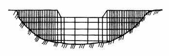 Кроме того, применяются мелкие сетчатые запруды, габионные плотины [7]. В ФРГ разработано заграждение для улавливания селевых потоков и плавающей древесины. Заграждение выполнено в виде решетки из стальных горизонтальных и вертикальных стержней (рис. 19), причем решетки образуют плоские каркасы, расположенные в направлении потока.