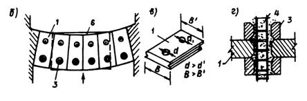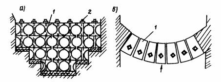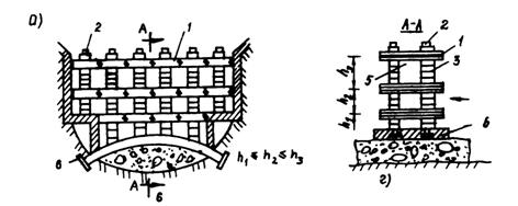 Рис. 29. Сооружение ряжевого типа: а - план; б - балка с двутавровыми окончаниями; в - лобовой узел; г - узел со стороны дороги Балки соединяют двутавровыми окончаниями, в плане они образуют зигзагообразное очертание вдоль дороги. Стыки узлов обжимаются металлическими тросами, пропущенными через отверстия в пазах двутаврового окончания. Вертикальные тросы передних узлов соединяются с фундаментом для повышения устойчивости на сдвиг и опрокидывание сооружения, а в задних узлах со стороны дороги нижняя часть тросов соединяется с нижними балками и обжимает узел, повышая его сопротивляемость на разъединение. В целом для защиты протяженных участков горных дорог более экономичными и надежными являются те сооружения, которые допускают большие перемещения, сопровождая и притормаживая селевой поток. Кроме того, эти сооружения могут быть неоднократно использованы. В предложенных вариантах сооружений использованы в основном промышленные отходы: изношенные автомобильные покрышки, бывшие в употреблении тросы и рельсы. 4.4. Защитные сооружения дорог из автомобильных покрышек в предгорной зоне от небольших потоковДля защиты объектов от действия селевых потоков и снежных лавин впервые автором работы предложено применение старых "башмаков автомобилей". Изношенные автомобильные покрышки податливы, допускают большие упругие перемещения, т.е. являются поглотителем энергии, надежно защищают несущие железобетонные элементы от динамических ударов и истирания. Покрышки легки, их нетрудно транспортировать и монтировать в труднодоступных местах селеактивных ущелий. Кроме того, за счет использования старых покрышек экономятся цемент, сталь, увеличивается срок службы сооружения, утилизируются отходы производства. Сметная стоимость защитных сооружений из покрышек вдвое ниже чем из железобетона. По зарубежным данным, долговечность покрышки в воде составляет 1500 - 2000 лет, а в атмосфере 50 - 60 лет. Арочное селезащитное сооружение (а.с. № 1330241) состоит из двух типов упругих блоков из изношенных покрышек, расположенных взаимно перпендикулярно ярусам, образуя по высоте сквозные каналы, а в плане - арочное очертание (рис. 30). Первый тип упругого блока включает 7 - 10 покрышек, скрепленных в поперечном направлении тросами разной длины с образованием клинообразной формы и расположенных горизонтально. Второй тип упругого блока состоит из 2 - 4 покрышек, скрепленных в поперечном направлении тросами одинаковой длины с образованием цилиндрической формы и при сборке расположенных вертикально. Блоки обжимаются между собой по вертикали тросами, нижние концы которых заанкерованы в фундаменты, а верхние концы соединены с дугообразными стальными шайбами. Для создания усилия обжатия тросы проходят через стыки соседних блоков первого типа и через проемы блоков второго типа. Особенностью сооружения является его эффективное энергопоглощение за счет значительной податливости несущих блоков. При необходимости повышения массивности и ограничения податливости блоков их полости заполняют булыжниками. Сооружение можно строить в узких ущельях для защиты мостов, дорожного полотна, регулирования и стабилизации русла реки.