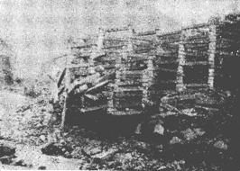 Рис. 22. Размыв подошвы сооружения ЗакНИГМИ на р. Дуруджи (Грузия) Для исключения размыва основания, облегчения массы элементов и упрощения геометрической формы сооружения разработана конструкция на арочном фундаменте (комбинация двух изобретений по а.с. 1606584, 1670030). Сооружение состоит из трапецеидальной плиты с двумя отверстиями разных диаметров, опорной шайбы с коническими уширениями, стойки периодического сечения и из арочного фундамента, (рис. 23). Трапецеидальная плита снабжена с двух сторон параллельными желобами и образует при сборке сплошной кривой диск, опирающийся на берег русла и на стойки. После завершения монтажа плит их желоба омоноличиваются бетонным раствором, образуя шпонки против сдвига. Стойки армированы пространственным стальным каркасом. Комбинация плит с опорными шайбами по высоте создает сквозные каналы. Нижние концы стоек заделываются в арочную железобетонную площадку, установленную на селевых отложениях русла. Диаметр опорных шайб со стороны верхнего бьефа больше, чем со стороны нижнего бьефа. Это связано с тем, что основной удар приходится на передние стойки. Цилиндрическая форма опорных шайб создает хорошую обтекаемость поверхности, тем самым повышает устойчивость против истирания влекомыми наносами. Опорные шайбы, в основном, работают на восприятие вертикальных нагрузок, так как на них опираются диски, а также защищают несущую стойку от непосредственного удара. Кроме того, они, допуская незначительные вращения, смягчают ударную нагрузку. Изменением диаметров опорных шайб регулируются параметры выходных и входных сквозных каналов. Это необходимо для исключения закупорки сквозных каналов при прохождении через них селевых потоков. Железобетонные шпонки между плитами предотвращают возможные взаимные сдвиги из плоскости по линии стыковки плит. Периодический профиль стоек за счёт конического уширения (а.с. № 1213116) исключает возможные сдвиги плит из плоскости диска, а также повышает сопротивляемость сечения на срез стоек между опорными шайбами. Это облегченное сооружение дает возможность экономить материал за счет замены стенки клинообразных блоков (а.с. № 1182104) на две стойки разных диаметров и уменьшения количества слоев; упростить конструкцию, так как массивные блоки заменены легкими плитами и шайбами, которые нетрудно изготовить в любых строительных организациях; улучшить их транспортирование и монтаж кранами средней мощности. Кроме того, допускается варьирование размеров сквозных каналов по высоте и их уклонов в зависимости от мощности селевых потоков, повышается эксплуатационная надежность за счет сохранения устойчивости на опрокидывание в случае размыва фундаментной части сооружения со стороны нижнего бьефа.