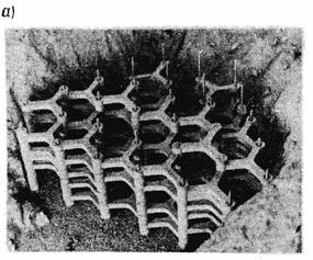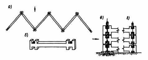 Рис. 9. Характер загружена и разрушения селезащитных сооружений: а - этапы загружения сплошных запруд; б - этапы загружения сквозных селеуловителей; в - этапы разрушения сквозного селеуловителя 3.2. Конструктивные особенности и анализ работы селезащитных сооруженийВ современном противоселевом строительстве используются земляные, бетонные и железобетонные плотины, глухие запруды из тех же строительных материалов, а также сквозные сооружения из железобетонных элементов в виде отдельных, соединенных между собой балок, сетчатые и решетчатые металлические конструкции различных видов. В последние 30 лет широкое распространение получили селеуловители сквозного типа различных конструктивных форм, среди них - железобетонные стержневые системы пространственного типа, разработанные в ЗакНИГМИ. Такая система состоит из равносторонних треугольников (каждая сторона которых представляет собой отдельную железобетонную балку), расположенных в трех разных параллельных плоскостях [7]. Железобетонные балки с отверстиями на концах располагают так, чтобы отверстия всех смежных элементов совпадали и в образуемые шахты вставляют арматурный каркас с последующим омоноличиванием бетоном (рис. 10).