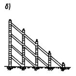 Рис. 24. Сооружение из плоских триад: а - общий вид - макет; б - сооружение из наклонных триад - поперечное сечение По высоте сооружения выполняют многоступенчатыми с пригрузочными участками для повышения устойчивости на сдвиг и опрокидывание. Применение данного типа сооружения по сравнению с системой, разработанной ЗакНИГМИ [7], дает возможность снизить расход стали на 30 %, бетона на 40 %, Однако недостаток предложенного сооружения состоит в том, что триады расположены в плане горизонтально, т.е. по отношению к поперечному удару падающих камней они работают в невыгодных условиях. С целью исключения этого недостатка и повышения жесткости конструкции разработано сооружение с наклонными триадами (а.с. № 1182113) и с наклонными отверстиями на концах триады. А в другом аналогичном сооружении на дно селеносного русла рядом с фундаментами укладываются блоки из автомобильных покрышек. (а.с, № 1377327) для исключения размыва нижнего бьефа. Наклонное расположение железобетонных балок-триад повышает жесткость сооружения на 80 %, обеспечивает режим работы всех элементов на восприятие продольных сжимающих усилий (рис. 24, б). В ААСИ разработана высокоэффективная конструкция сооружения из прямолинейных элементов с тремя отверстиями (по краям и в середине) для фиксации со стойками. Экономичность сооружения с двухпролетными балками (а.с. № 1511323) по сравнению с сооружениями ЗакНИГМИ [7] достигается в результате укрупнения стержней, упрощения монтажа и транспортирования. Укрепление балок позволяет регулировать размеры треугольных ячеек по всей площади и по высоте сооружения. В результате чего достигается рациональное расположение элементов, обеспечивающее перераспределение усилий, и повышается жесткость сооружения как в целом, так и отдельных его частей (рис. 25, а, б)